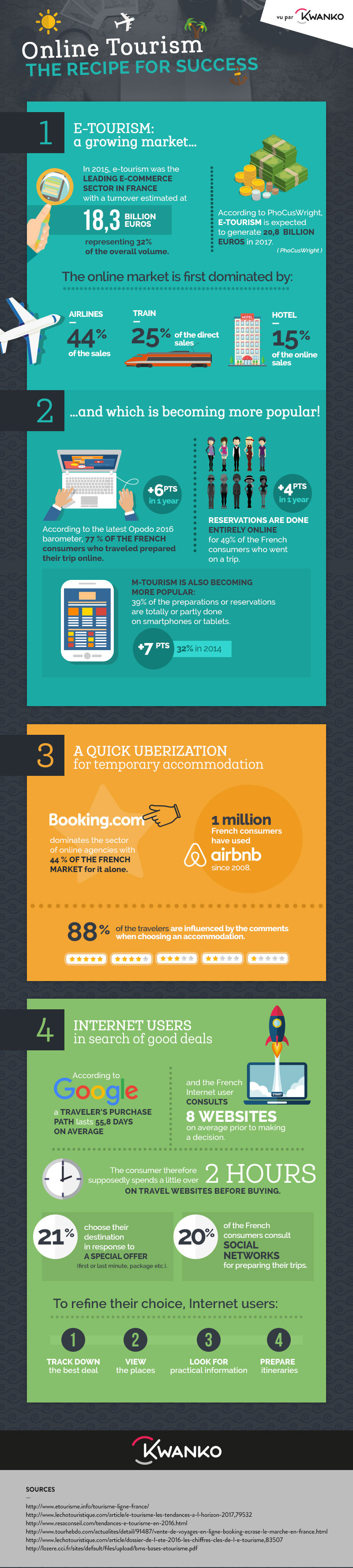 Year after year, the online tourism sector confirms its progression and becomes the leading sector of e-commerce in France. On-line agencies, buying journeys, traveller reviews … Find at a glance all the key figures of online tourism.