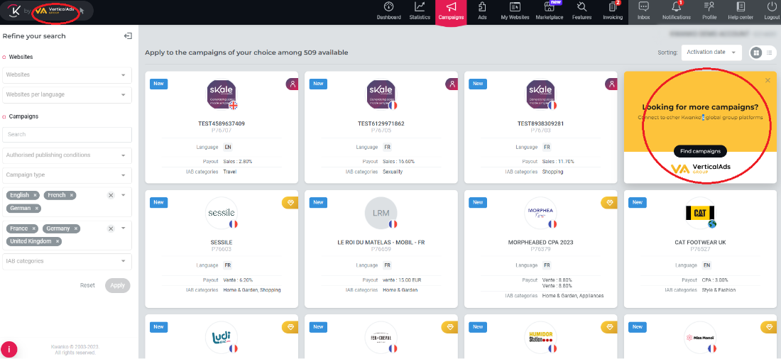 Un an après l’annonce de la fusion entre Kwanko et VerticalAds Group, nous sommes heureux d’annoncer le lancement d’une nouvelle fonctionnalité, désormais disponible sur votre interface publisher. Celle-ci vous offre un moyen simple et pratique de vous connecter aux autres plateformes d’affiliation du groupe VerticalAds et d’accedez ainsi à plus de programmes d’affiliation.