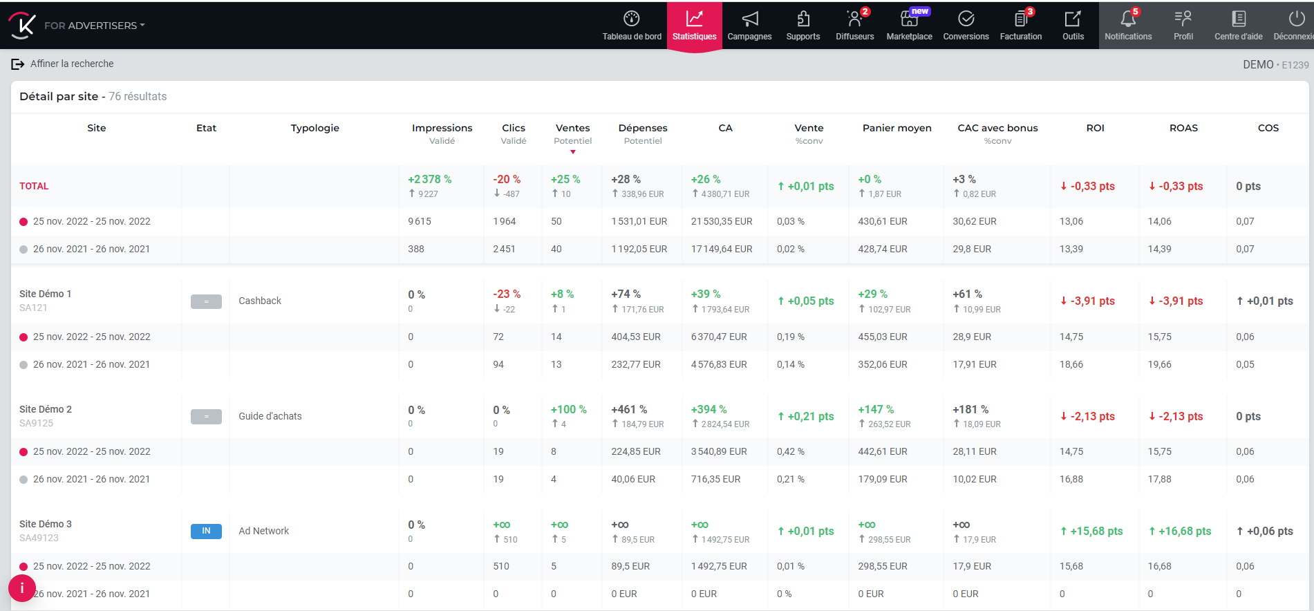 Notre comparateur de statistiques va vous permettre d’analyser l’évolution des résultats de votre campagne sur deux périodes et par affilié. Ainsi vous pourrez très facilement suivre les sites qui ont le mieux performé sur la période définie.