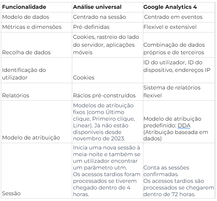 Primeiro de tudo, você notará que existem muitas diferenças entre UA e GA4, que listamos abaixo, mas a mudança mais importante é o modelo de atribuição.